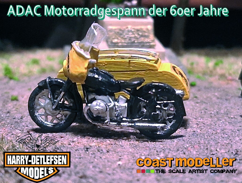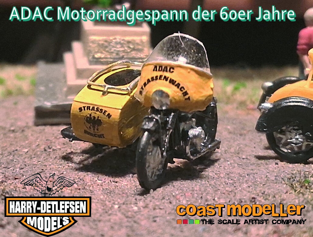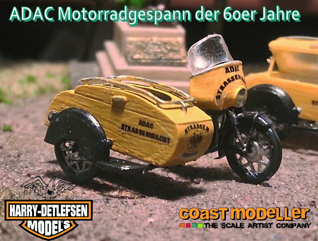 Aus der Zeit als Motorräder noch zum Alltag auf den Straßen gehörte. Das ADAC Gespann war der freundliche Pannenhelfer für alle Probleme. Der Nachbau im Maßstab 1:87 ist aus Resin gefertigt und wird mit den Decals geliefert